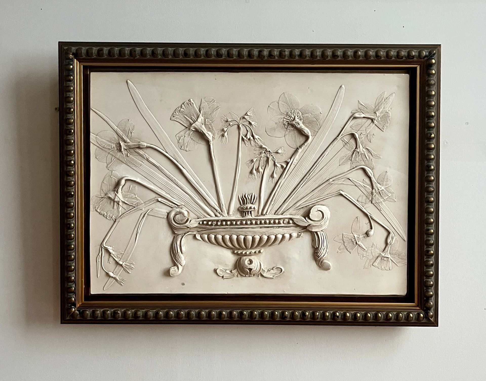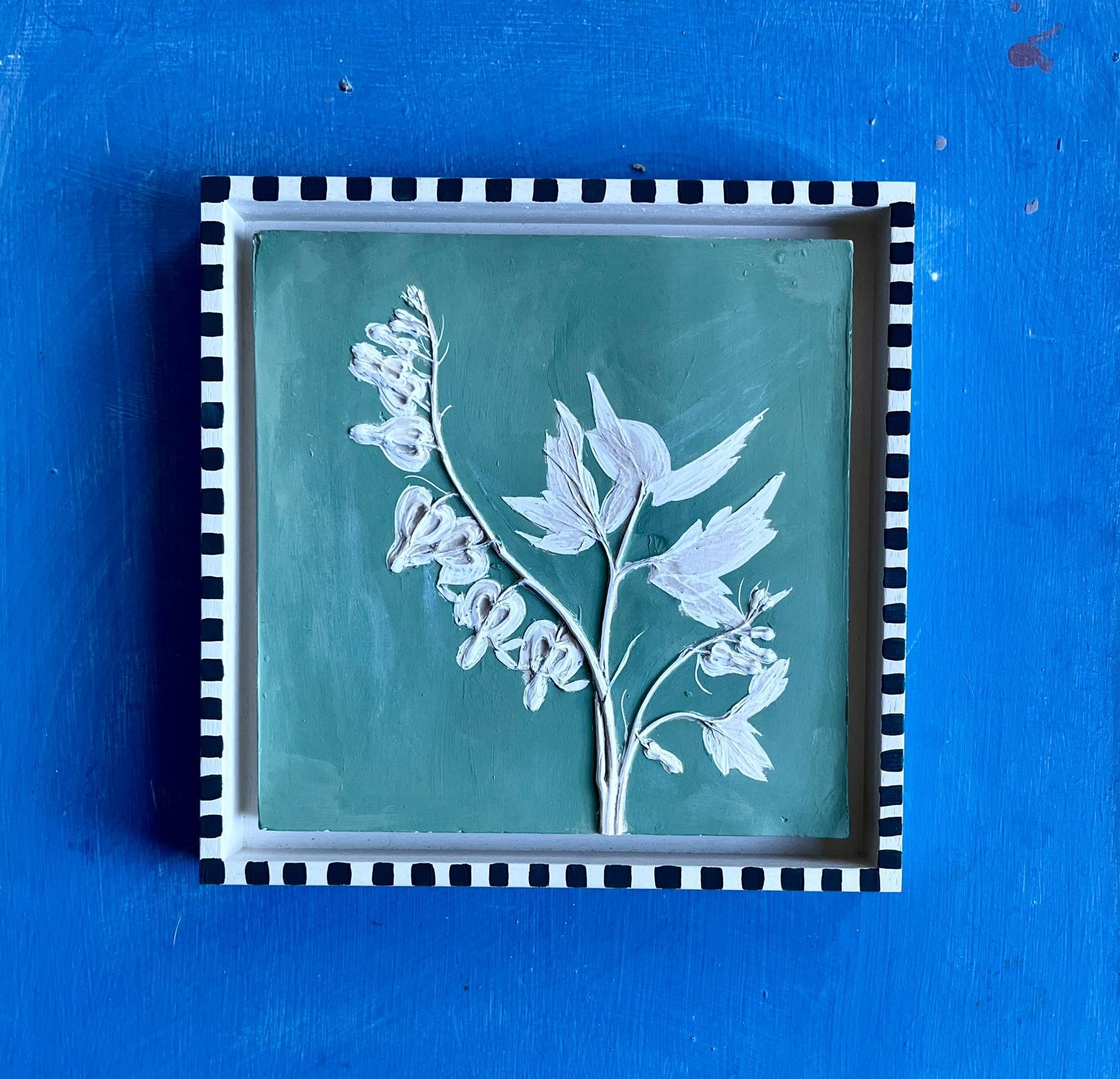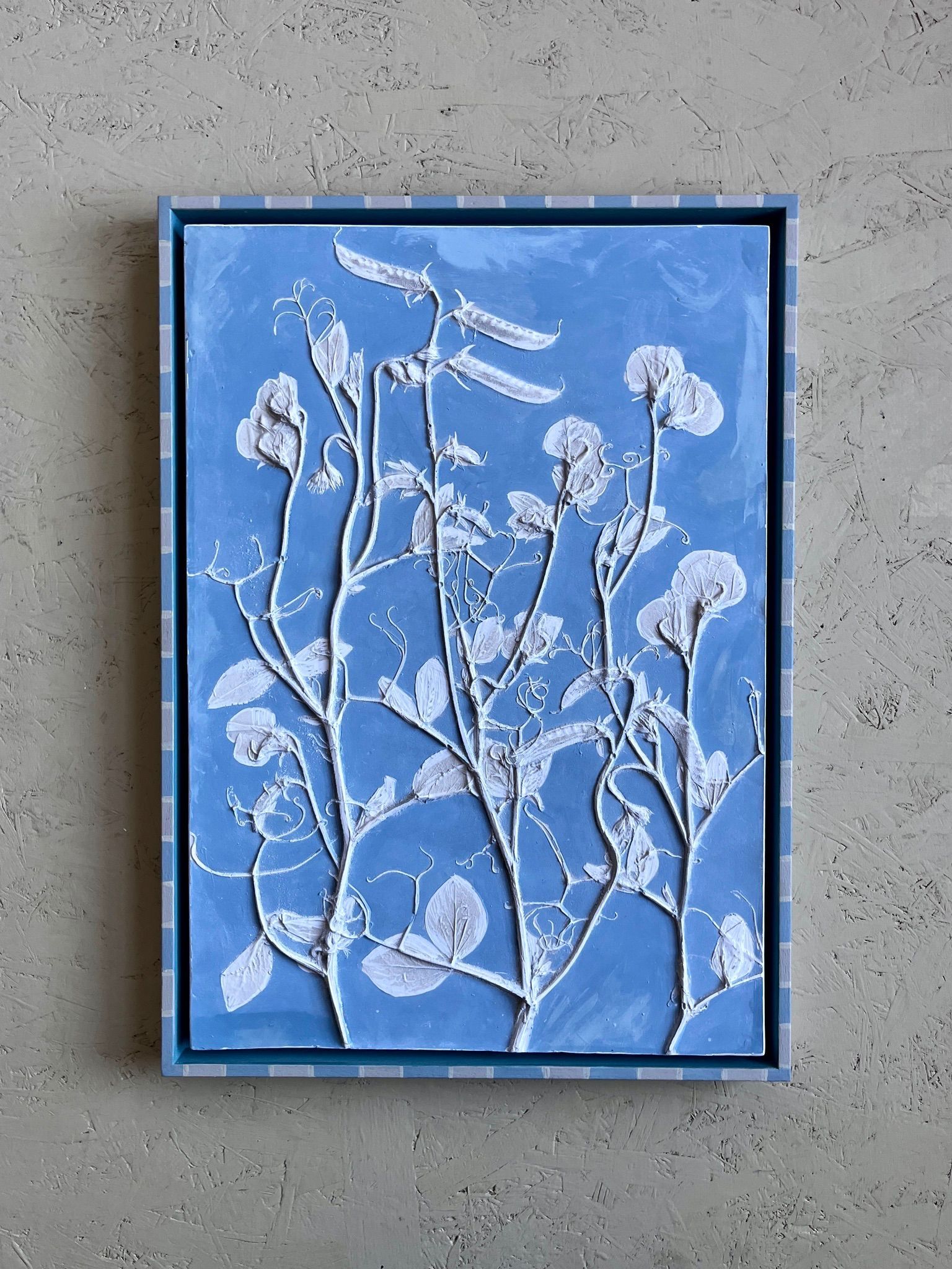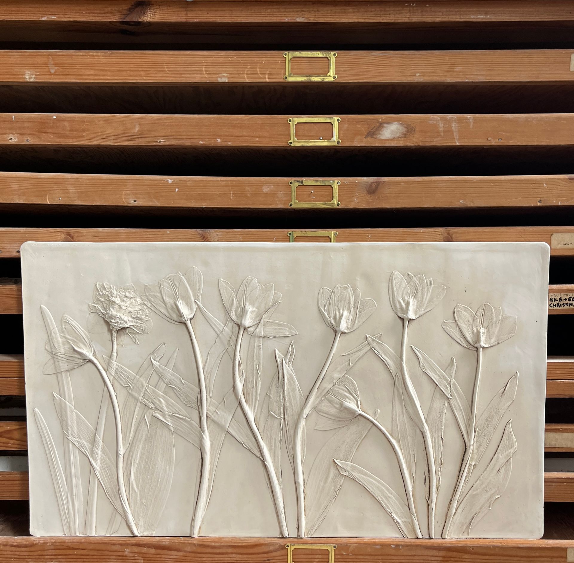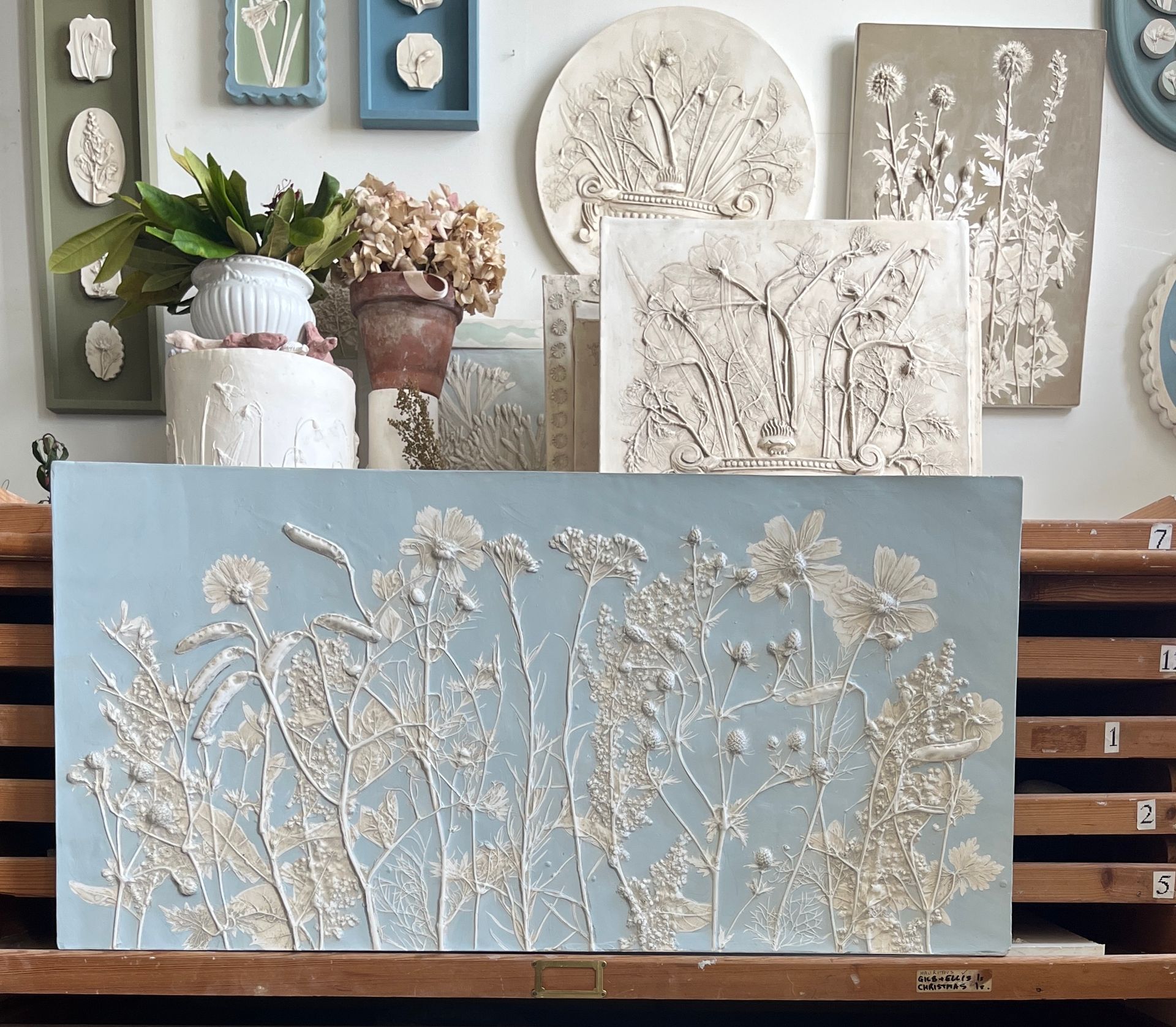 Her practice is rooted in the close observation of nature, inspired by her mother’s remarkable garden in Fife. This early influence fostered a lifelong respect for the natural world that continues to shape her work. Alongside this, Katy’s background in Art History, specialising in 18th-century English art and architecture, brings a deep appreciation of classical sculpture, intaglios, and architectural ornament. By merging this language of historical plasterwork with botanical forms, she reinterprets an ancient craft for a contemporary context.