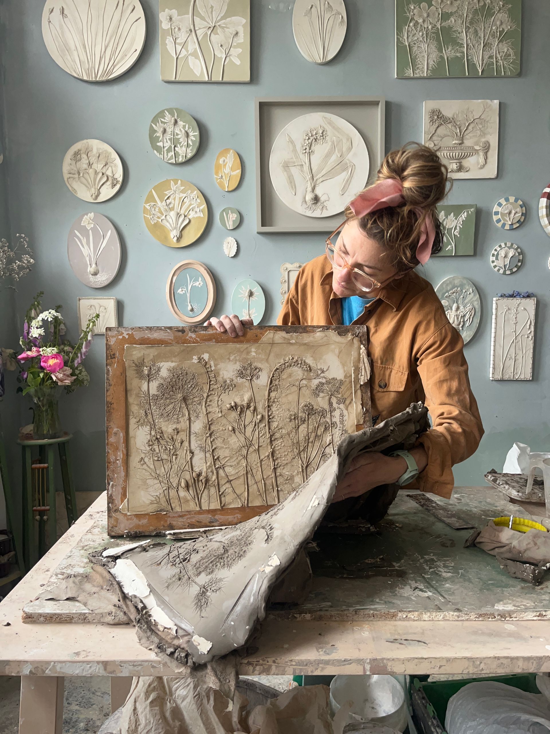 Katy Eccles is the artist behind Imprint Casts, working from her studio in Edinburgh. She creates plaster artworks by pressing flowers and objects into clay, capturing their delicate impressions and preserving them as permanent forms.