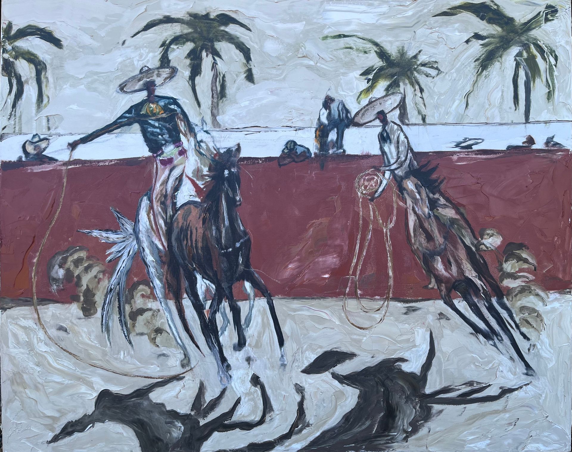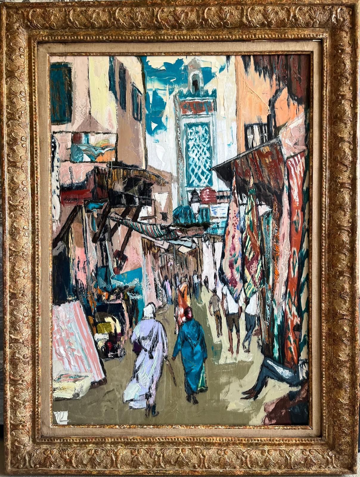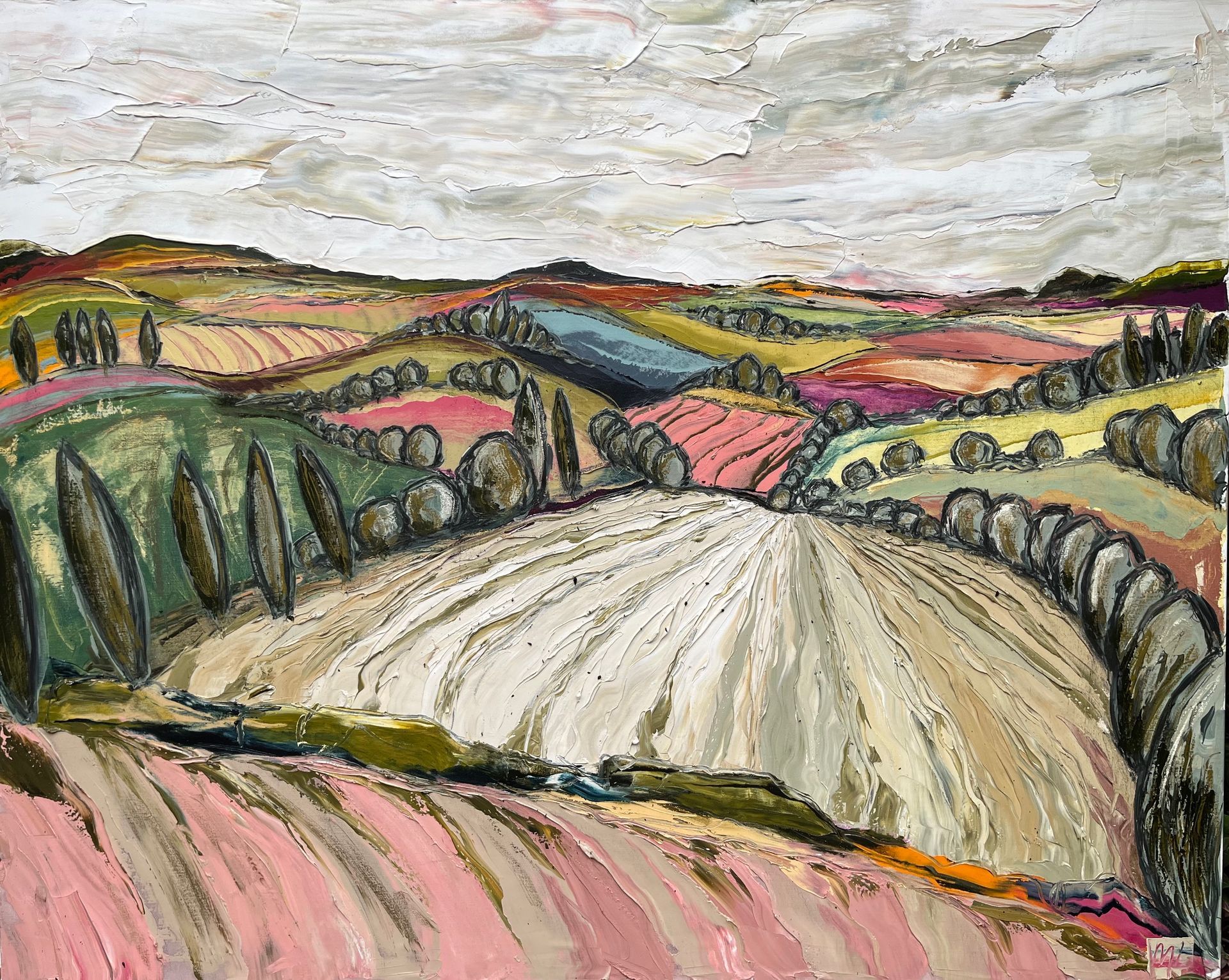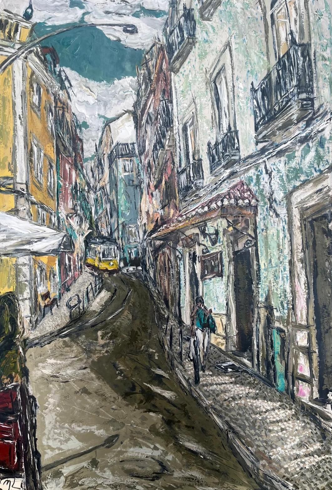 He makes large scale paintings of the places he visits, attempting to recreate the sense of vitality and motion he observes by applying thick layers of oil paint with a palette knife, and then scratching lines and marks into the surface in the sgraffito style to imply movement, as well as scraping back layers of paint and reworking his surfaces to give a three dimensional feel to the image. He has worked from locations in the UK and Europe.