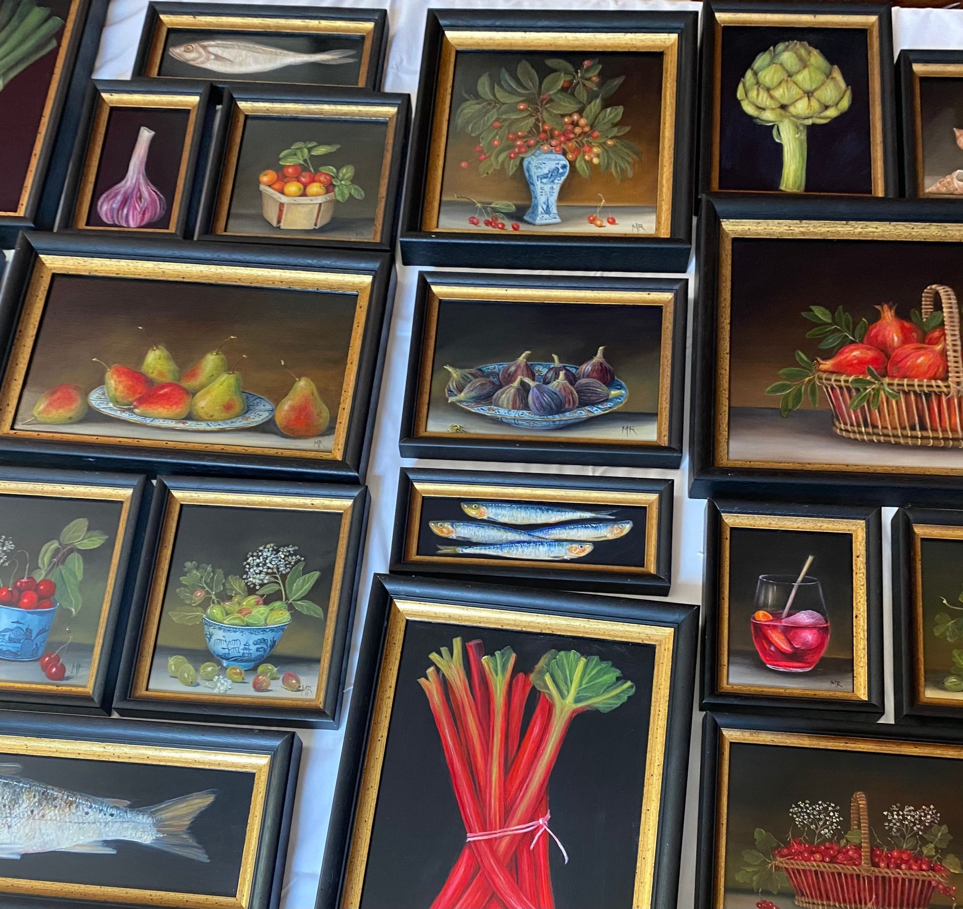 Mimi Roberts is an artist who specialises in still life painting. Inspired by artists from Italy, Spain and the Netherlands from the 16th and 17th centuries, the subject of her work is taken from life. Food is the major theme, fish, fruit and vegetables froming the main part of her portfolio.